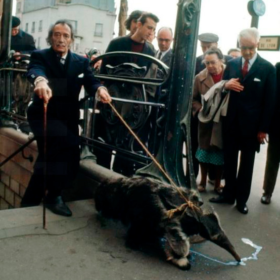 Salvador Dali przechadzajacy się z mrówkojadem po ulicach Paryża. Twórczość Dali’ego spopularyzowała się nie POMIMO tego, że był ekscentryczny, ale DLATEGO, że był eskcentryczny.